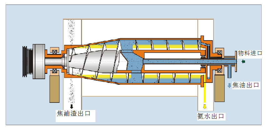 煤焦油三相分(fèn)離工作原理(lǐ)如上圖所示:焦油物料通過(guò)物料進口進入離心機內部,物料在巨大的(de)離心力作用下,密度最大的焦油渣沉降到轉鼓的內壁上,由螺旋輸送器輸送到焦油渣出口並排出。由於氨水和焦油(yóu)的密度不(bú)同,兩中液體在(zài)離(lí)心力的作(zuò)用下形成兩個同心的液環,密度小的氨水形成液環在最裏麵(如圖的黃色所示(shì)),通過氨水(shuǐ)溢流口(kǒu)排出;密度大的焦油(yóu)形成液環介(jiè)於焦油渣和氨水液環之間(如圖的藍色所示),通過焦油溢流口排出。