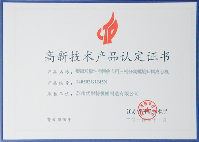 高新技術產品認(rèn)定證書--餐廚垃圾油脂回(huí)收專用三相分離(lí)螺旋卸料離心機-榮譽資質-臥螺離心機-分離機-離心機廠家-蘇州17.c-起草网登录入口機械(xiè)製造有限公司(sī)