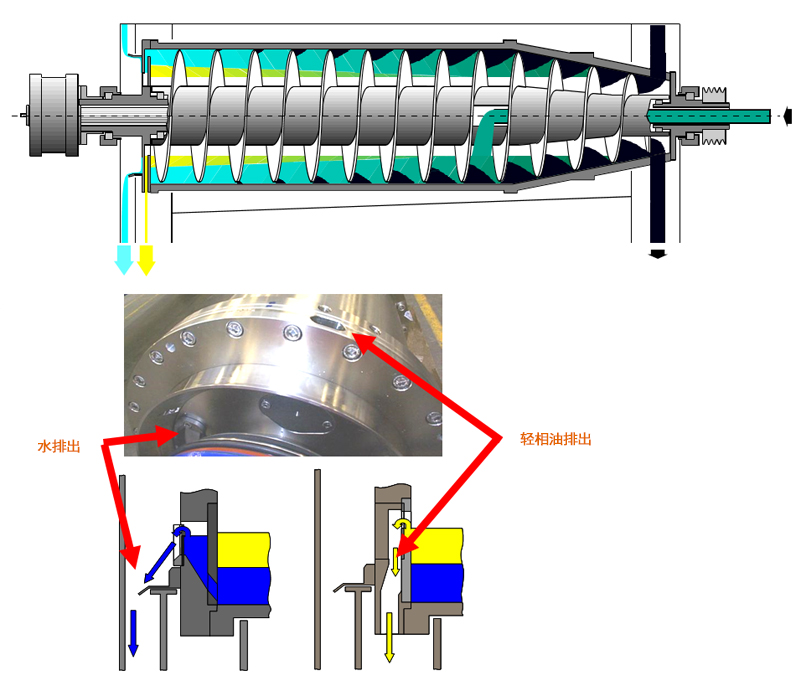 工作原理: 三相型臥(wò)式螺旋卸料沉降離心機與標(biāo)準型臥式螺旋卸料沉降離心機的(de)工作原理(lǐ)相似,以固體密度不同,依靠離心力場實現(xiàn)沉降分層,越(yuè)輕的液相越靠近回轉(zhuǎn)軸心線,越重的液相越靠近轉鼓內壁,最(zuì)重的固相沉降在轉鼓內壁上,輕重液相從門設計的各自(zì)通道排出,固相被螺旋輸料器排出。 部分三相(xiàng)分離機(jī)可配備向心泵,二液相(xiàng)的其中之一可由(yóu)向心(xīn)泵排出,另一液相經由罩殼集液腔排出。采用向心泵排液可減少液(yè)體氣化,並防止分離後的(de)液相在罩(zhào)殼內(nèi)相互滲漏重新混合(hé)。 三(sān)相離(lí)心(xīn)機的用途可分為:輕(qīng)液相/重液相/固相三相分離 輕固相/液相/重固相三相分離 輕液相/固相/重液相三相分離 標準型(xíng)三相(xiàng)離心機是指用於:輕液相(xiàng)/重液相/固相的三相分離機
